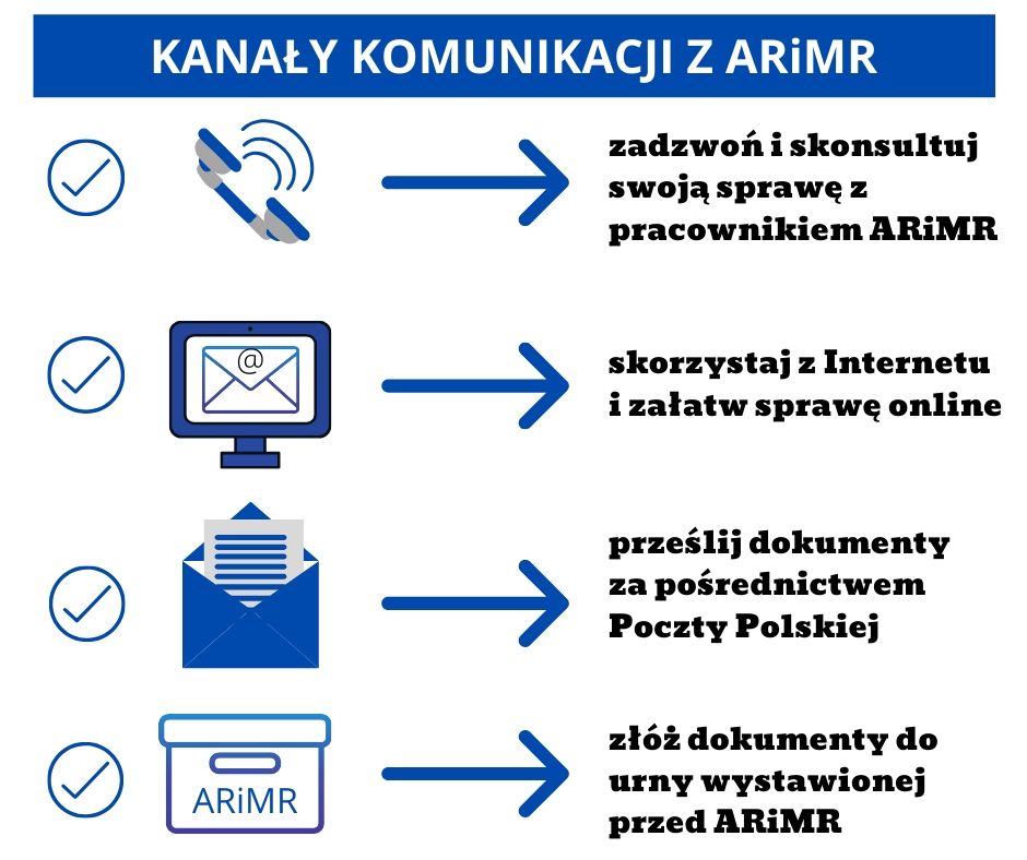 - kontakt z ARiMR – wyłącznie telefoniczny lub pisemny (za pośrednictwem poczty tradycyjnej lub elektronicznej), numery telefonów i adresy e-mail będą dostępne w widocznym miejscu przy wejściu do placówki Agencji;