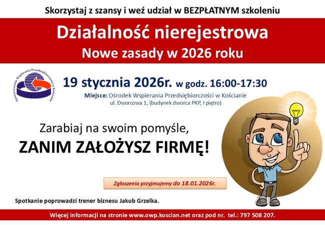 Miejsce: Ośrodek Wspierania Przedsiębiorczości w Kościanie, ul. Dworcowa 1 (budynek dworca PKP, I piętro).
