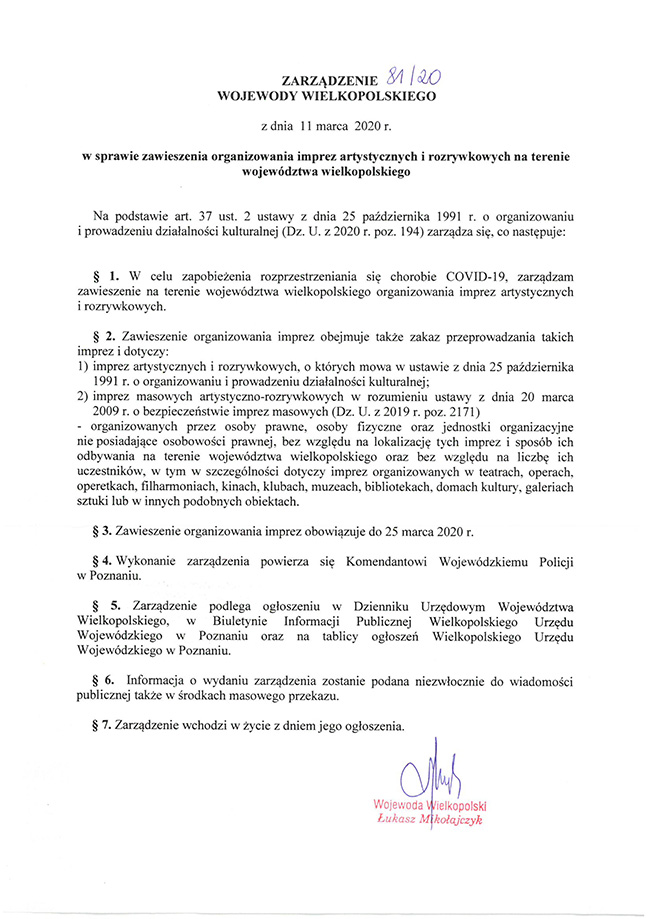 Zarządzenie Wojewody Wielkopolskiego w sprawie odwołania imprez masowych
