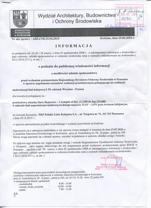 Informacja o możliwości udziału społeczeństwa w realizacji przedsięwzięcia - przebudowa linii PKP