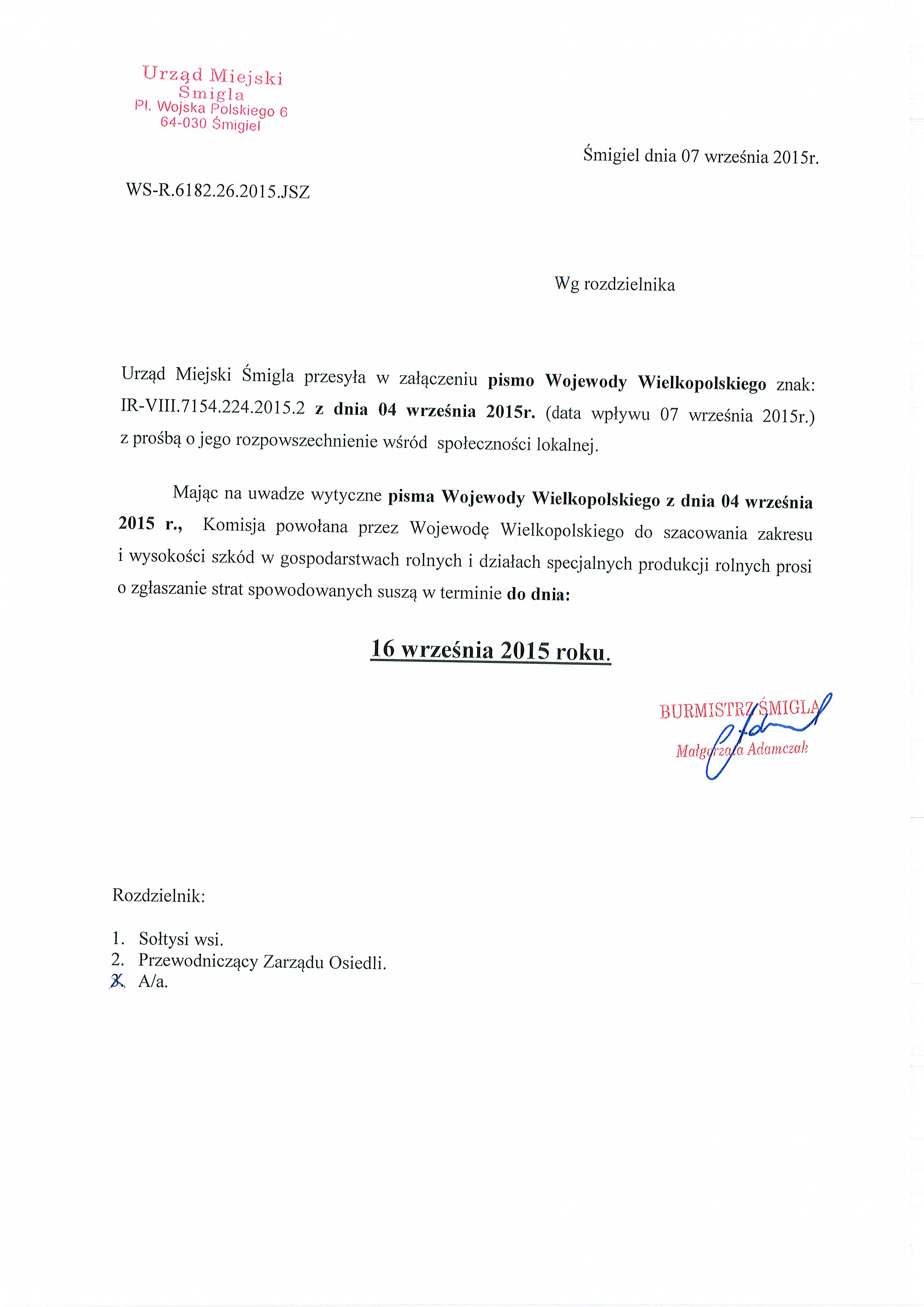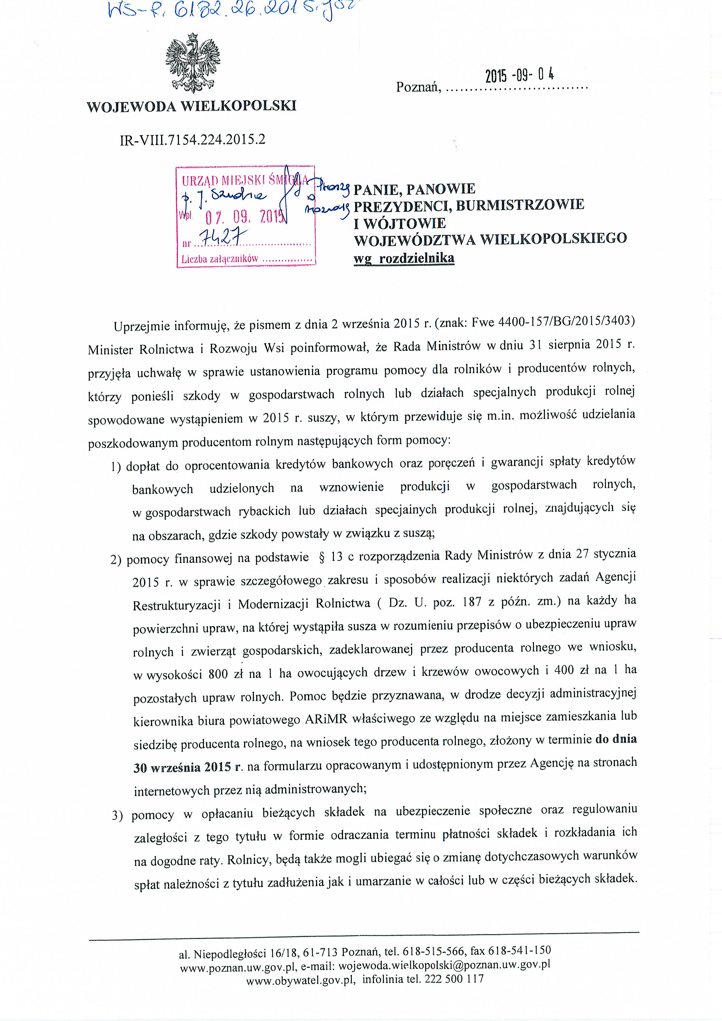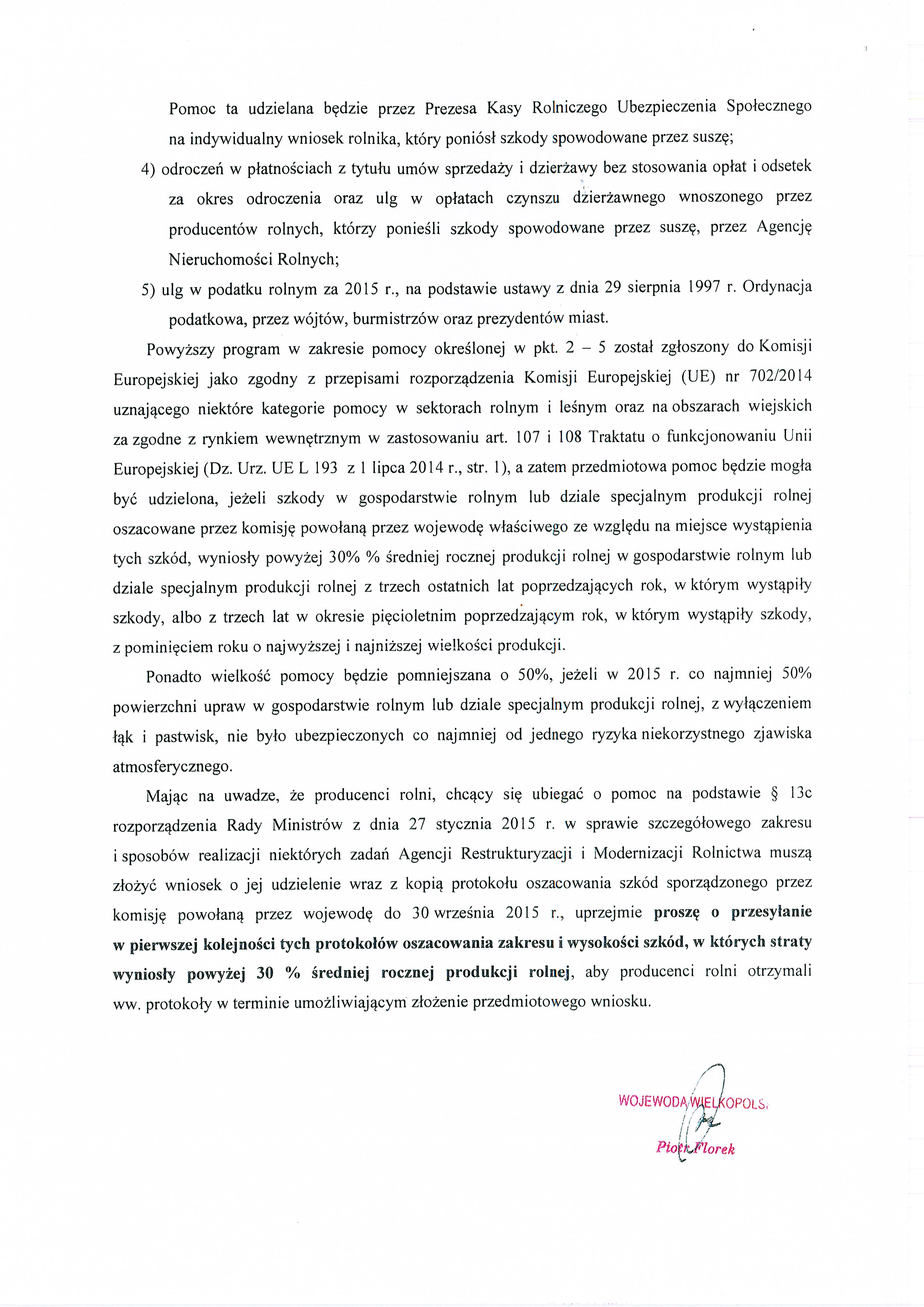 Mając na uwadze wytyczne pisma Wojewody Wielkopolskiego z dnia 04 września 2015 r., Komisja powołana przez Wojewodę Wielkopolskiego do szacowania zakresu i wysokości szkód w gospodarstwach rolnych i działach specjalnych produkcji rolnych prosi