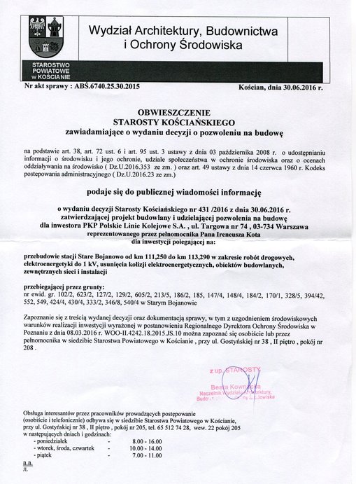 Obwieszczenie Starosty Kościańskiego dot. pozwolenia na przebudowę stacji PKP w Starym Bojanowie