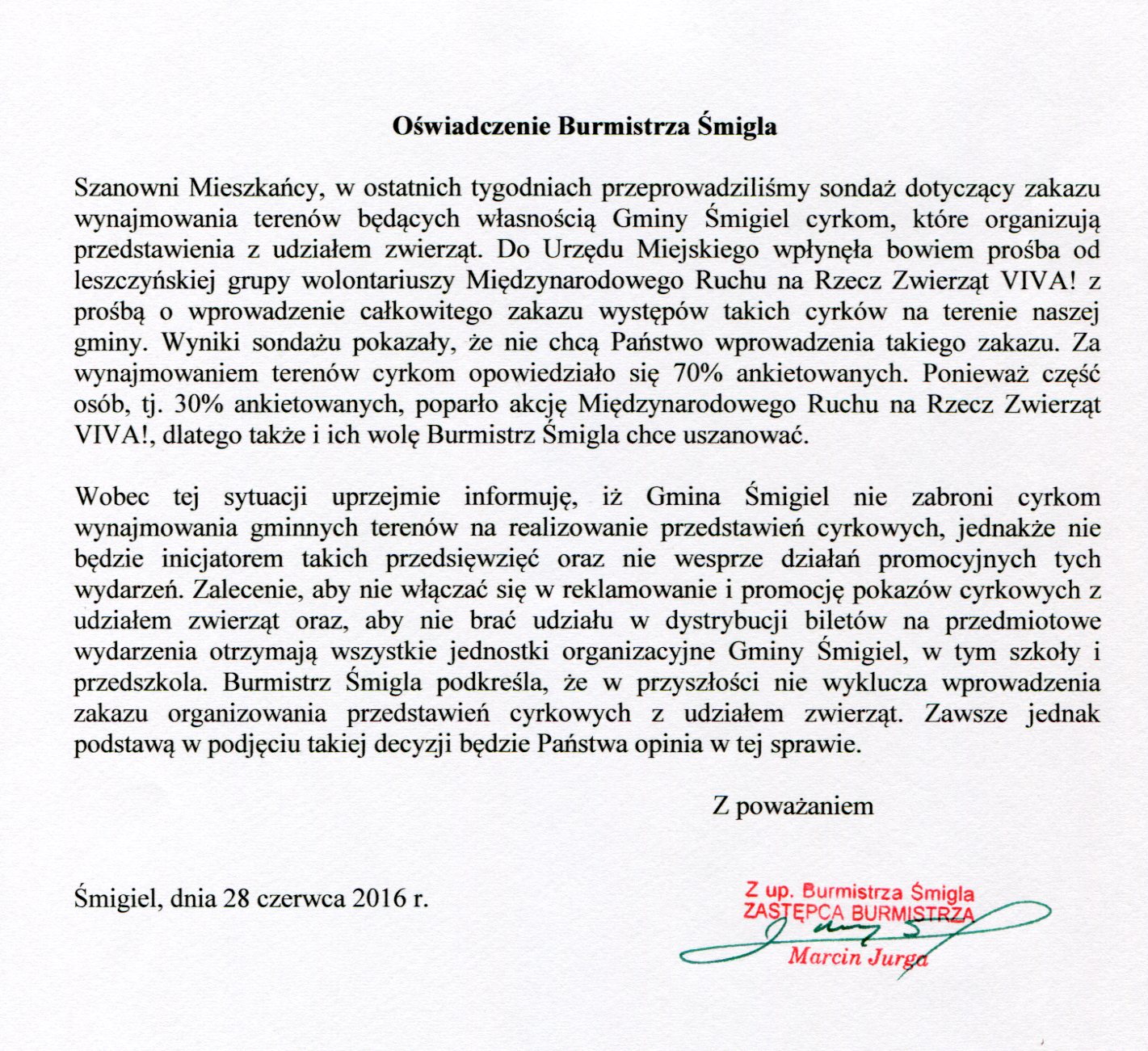 Oświadczenie Burmistrza Śmigla w sprawie wynajmowania terenów gminnych cyrkom