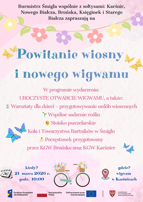 uroczyste otwarcie wigwamu, a także warsztaty dla dzieci - przygotowanie ozdób wiosennych, wspólne sadzenie roślin, stoisko pszczelarskie Koła i Towarzystwa Bartników w Śmiglu.